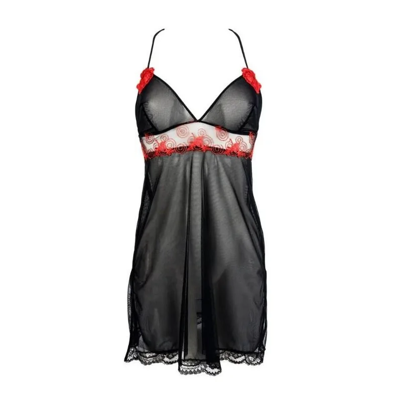 Cette nuisettes En Forme triangle plongeante Lise charmel est souligné de jolies fleurs rouges base noires.