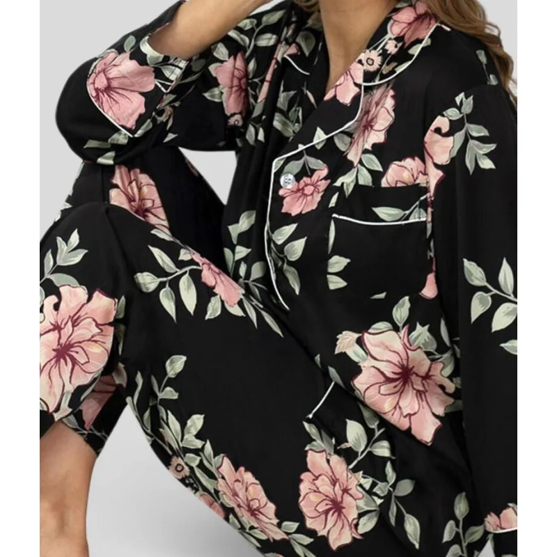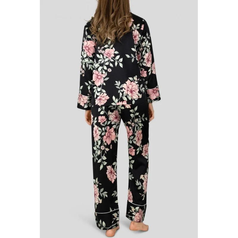 Chemise et pantalon de Pyjama satin en tissu imprimé, composé d’un pantalon doux souple et d’un haut manche longue boutonné à col chic